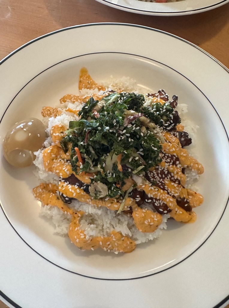 Hoisin marinated pork belly glazed with house-made Korean BBQ sauce over jasmine rice topped with Kimchi aioli, Asian slaw, sesame seeds & a tea brined soft boiled egg.