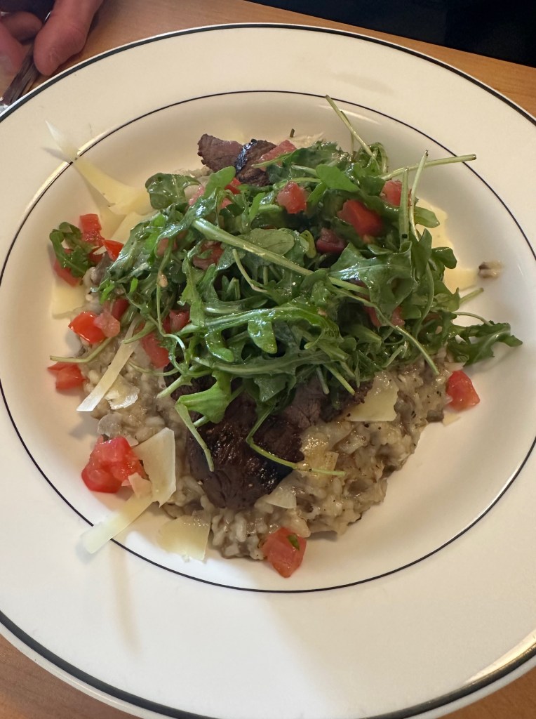 Chef’s choice of marinated steak on a bed of mushroom and herb risotto topped with arugula and tomato in a lemon vinaigrette, shaved parmesan cheese and crispy fried pickled shallots.