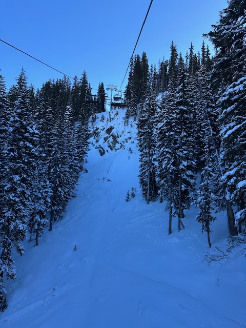 We took an ungroomed trail covered entirely in powder. To our surprise, there was about two feet of fresh powder. Many people were falling down this trail, yet it was incredibly fun! At one point, I fell and as I tried to stand and reattach my ski, my leg plunged through the snow, well past my knee. It was quite the experience, absolutely incredible.