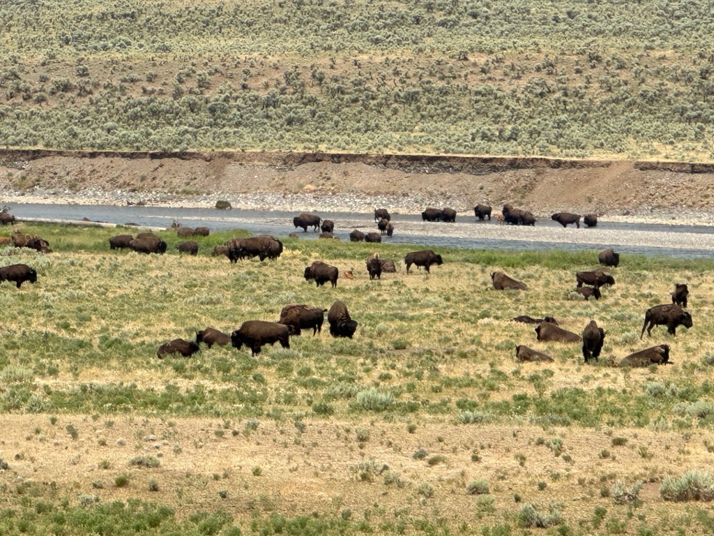 Then we spotted a herd of bison, which was so cool. Some of them were massive, and there were also little babies, called red dogs, running around. They were absolutely adorable.