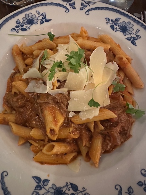 Slow cooked short rib ragu with gluten free penne and parmesan cheese