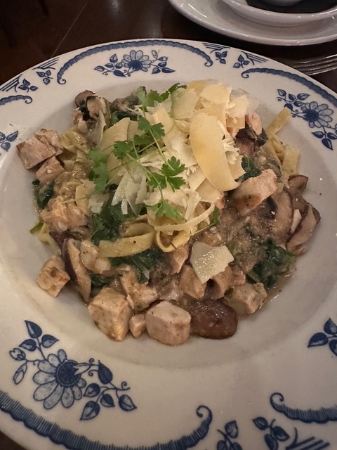 Homemade fettuccini, wild mushrooms, spinach, parmesan, porcini cream sauce