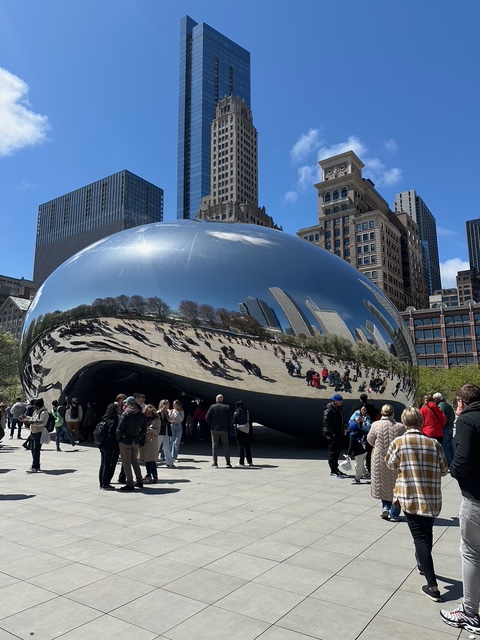 The sculpture’s shiny surface was inspired by liquid mercury. It reflects everything around it—the people walking by, the city lights, the skyline, and the green space of Millennium Park. It captures the energy and beauty of the park perfectly. And because it’s so reflective, people are naturally drawn to touch it and see their own image, which gives it a fun, interactive quality.